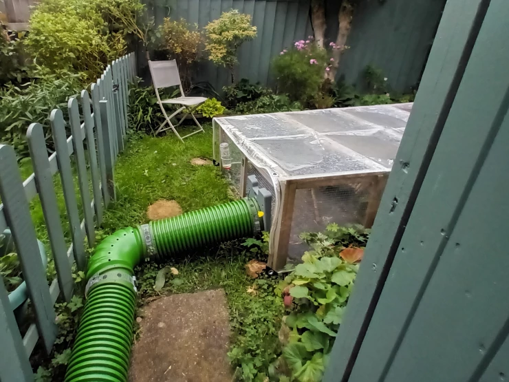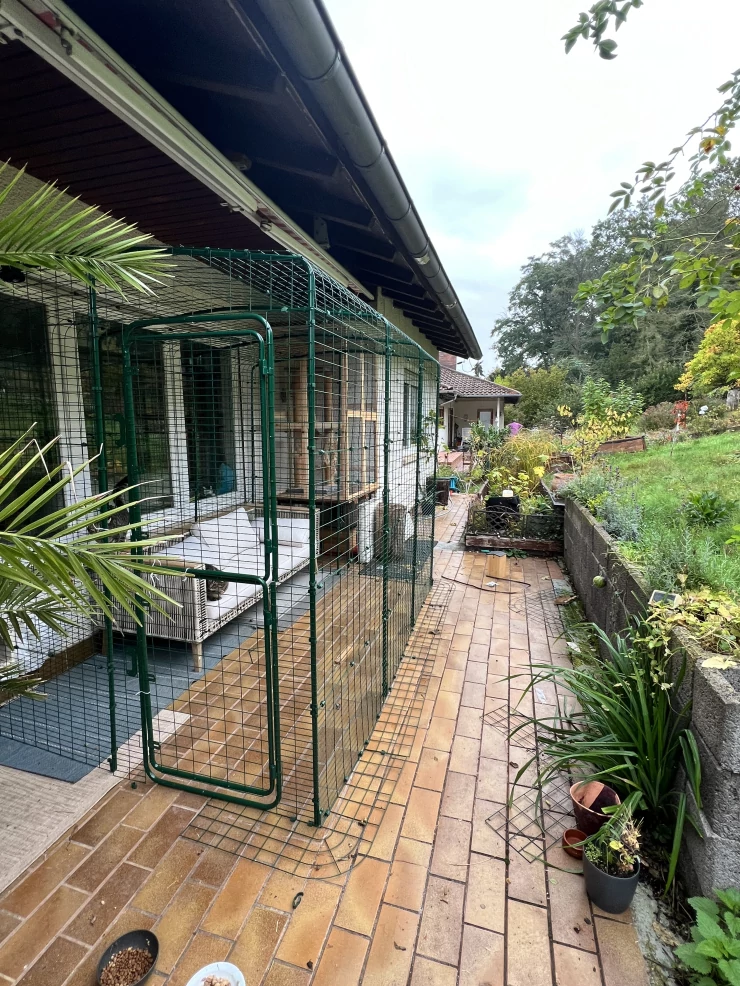 Caption: Van de schuur naar het hok en verder. 12 meter plezier voor onze familie van 5 reddingskonijnen.