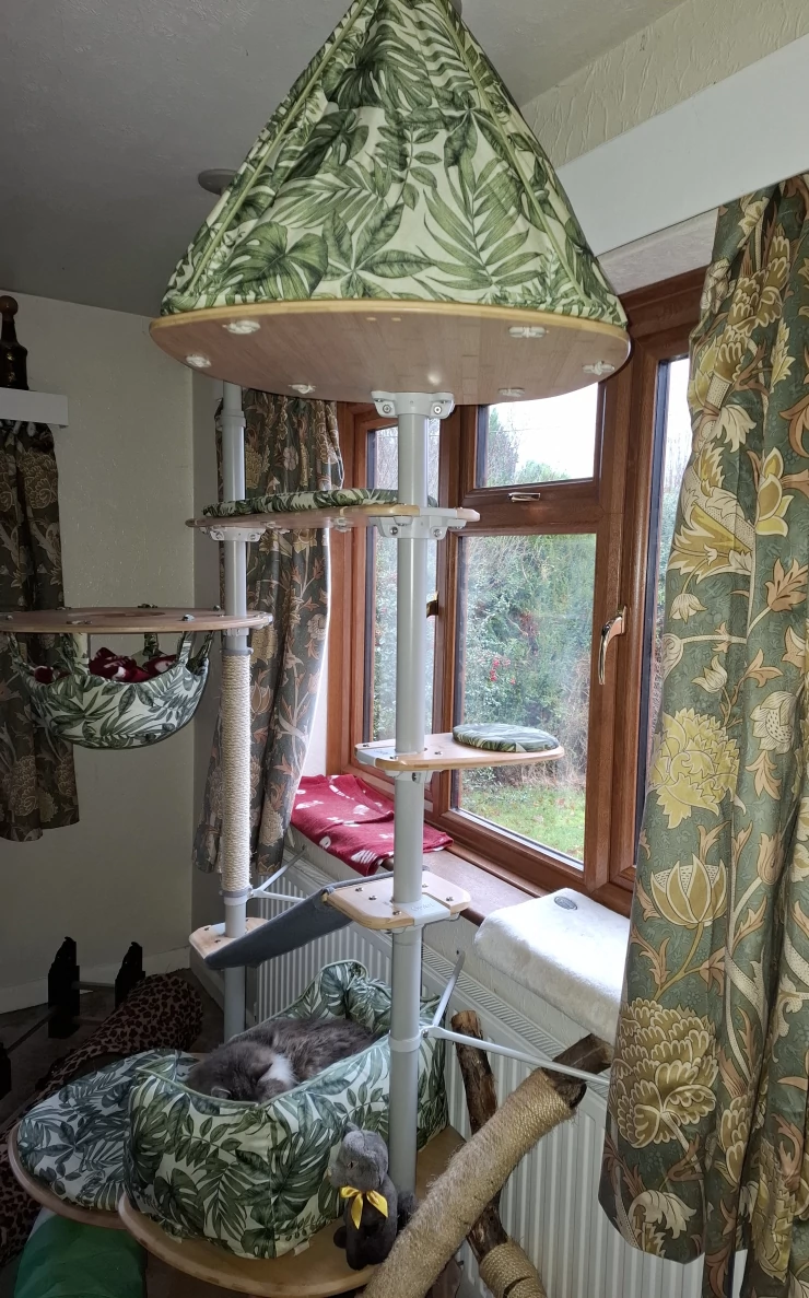 Caption: Tweelingpaalkattenboom met bed, hangmat, tent en krabber
