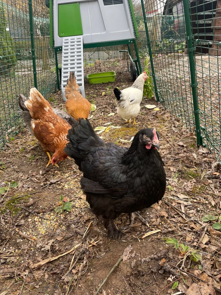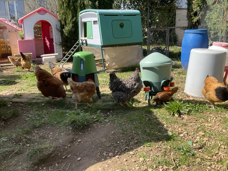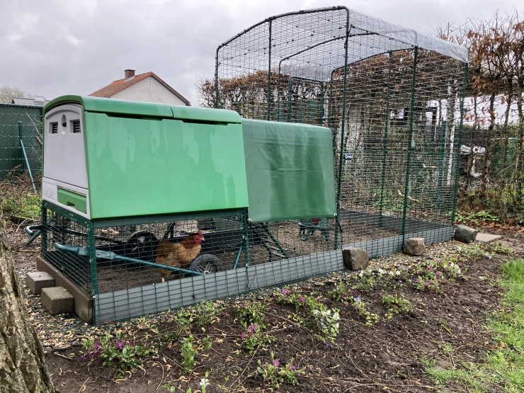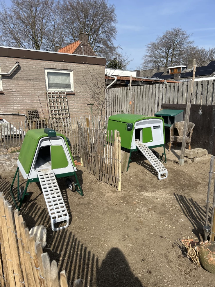 Caption: Eglu, waterer, aangesloten voederhuisje, onze kippen zijn in voor een traktatie