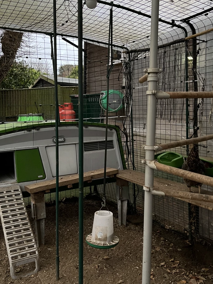 Caption: Red's scharrel vakantiehuis bedekt met een van Omlet's vele accessoires "heavy duty tarp" op loopafstand van haar Omlet Eglu Go up.