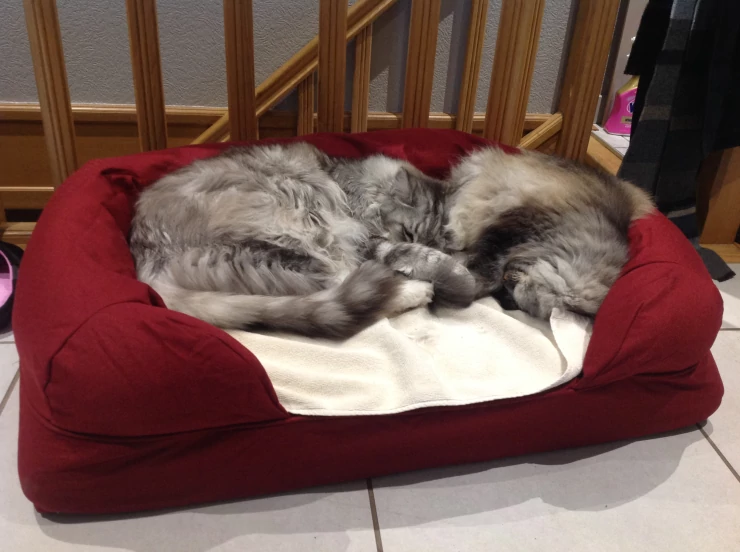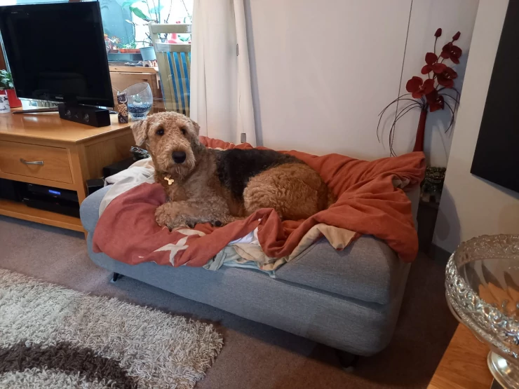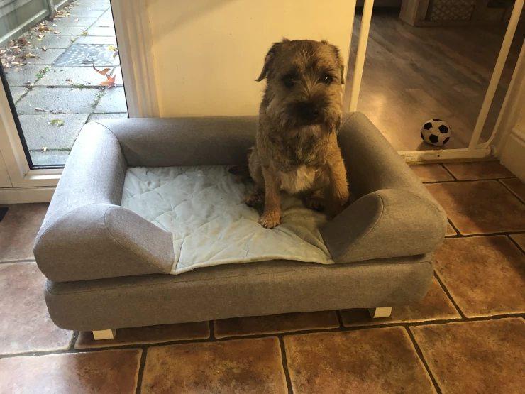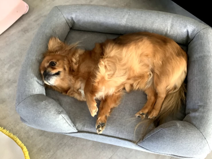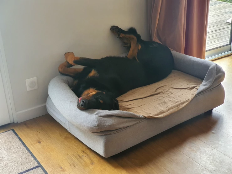 Caption: Deze hond houdt ervan zich uit te rekken in zijn bolster bed