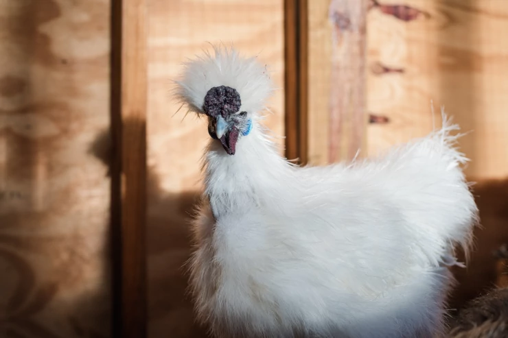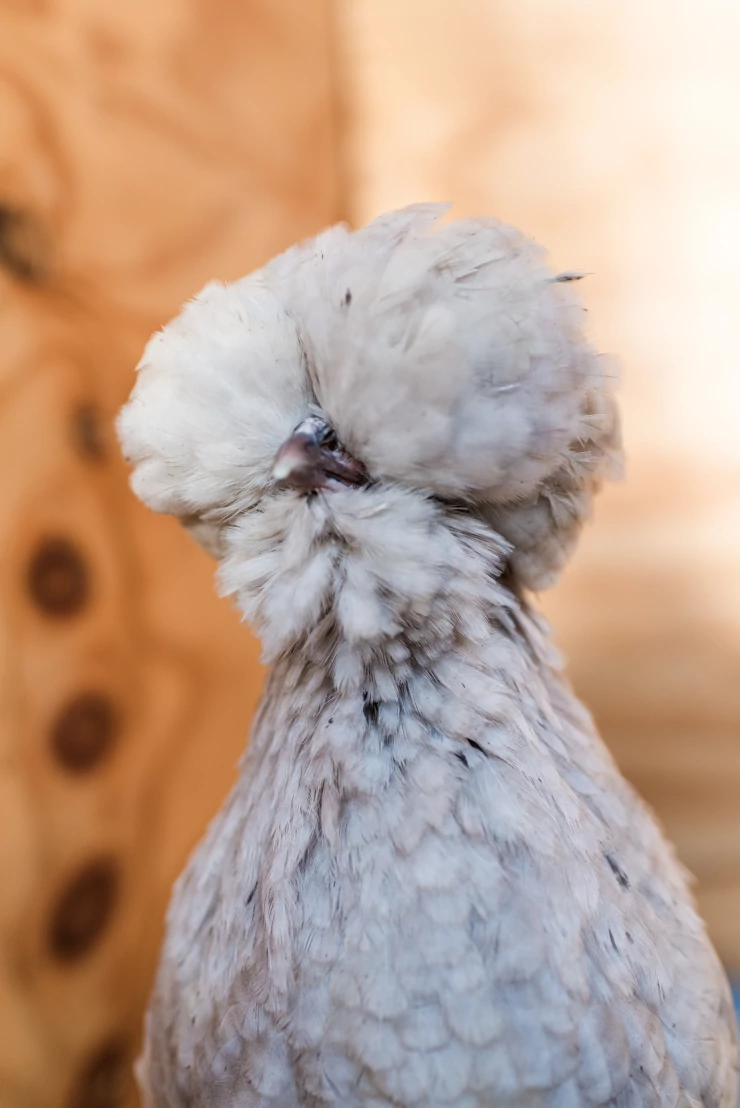 Caption: Een witte silkie kip met prachtige veren.