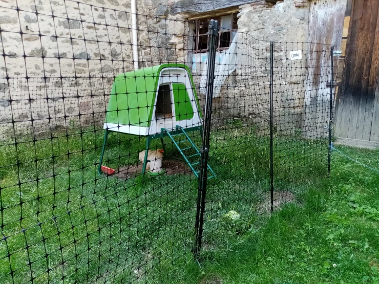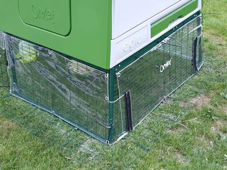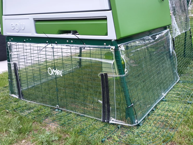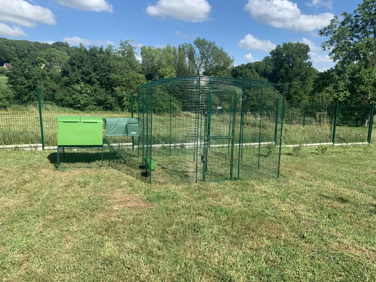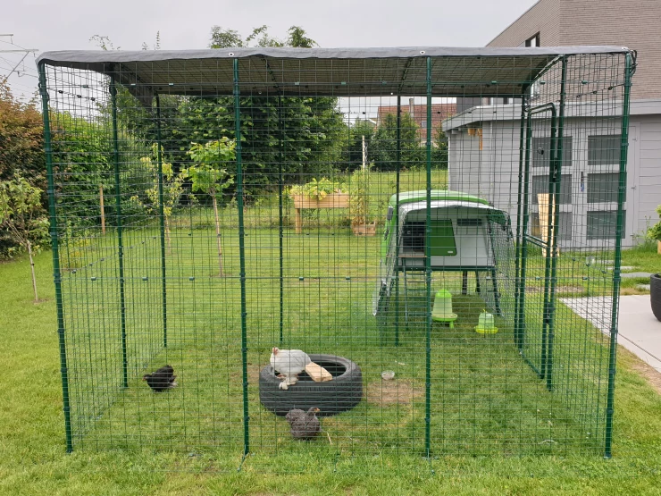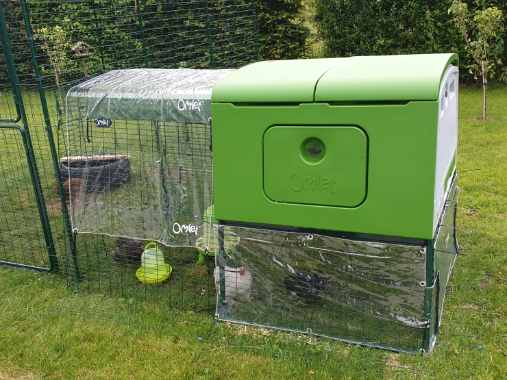 Caption: Groen Eglu Cube groot kippenhok met ren verbonden met Omlet inloop kippenren in tuin