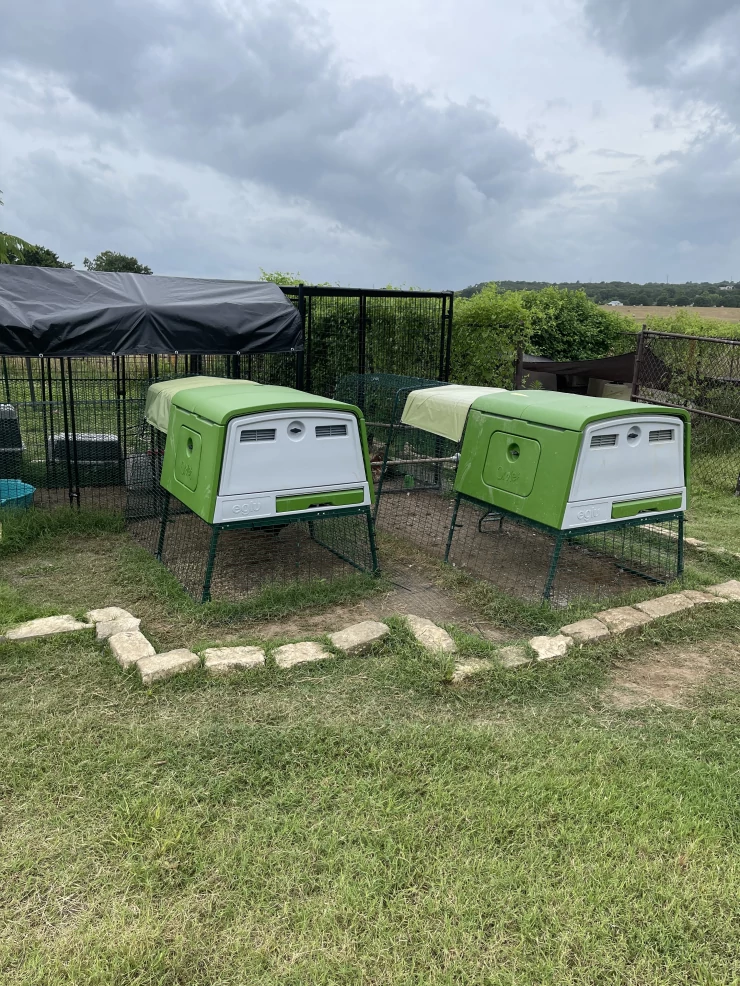 Caption: Twee groene Eglu Cube grote kippenhokken en rennen in de tuin