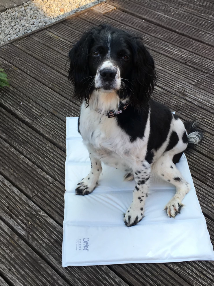 Caption: Charlie op zijn koele mat wachtend op een traktatie