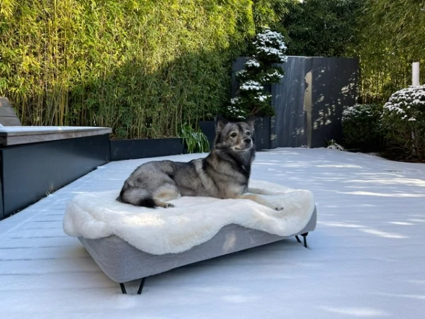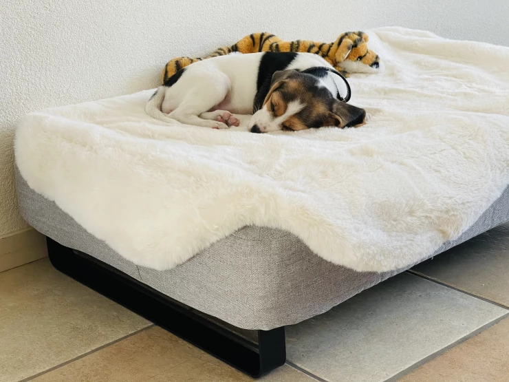 Caption: Hond liggend op Omlet Topology hondenbed met schapenvacht topper en zwarte haarspeld voeten