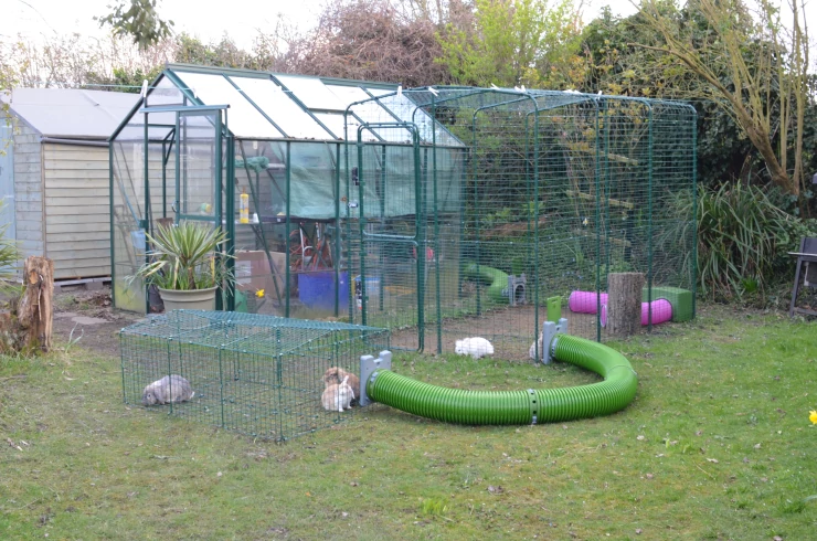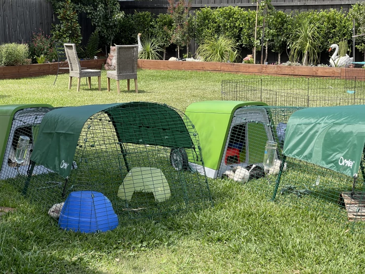 Caption: Twee Eglu Go konijnenhokken in een tuin.