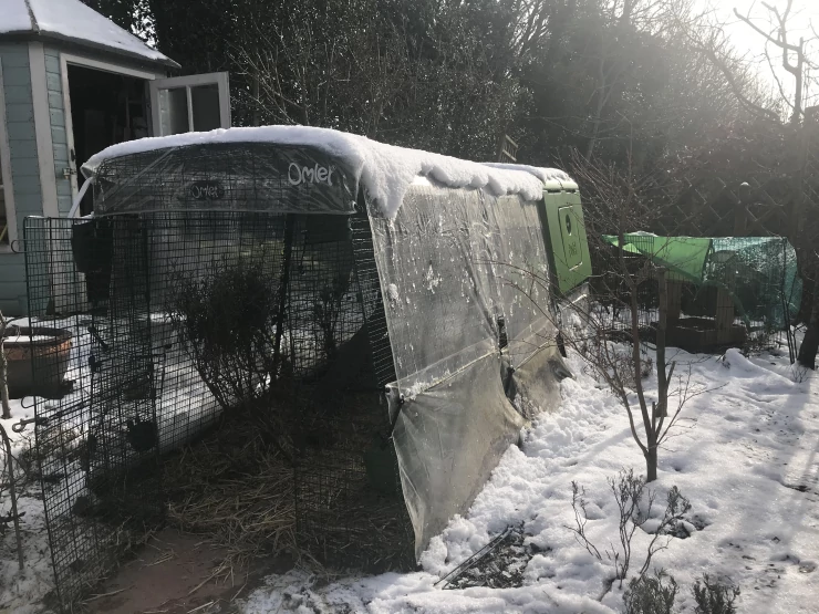 Caption: Drie Omlet Eglu Go konijnenhokken in de tuin bedekt met Snow