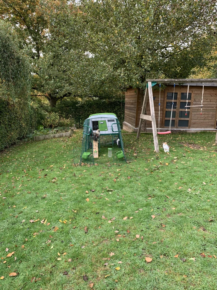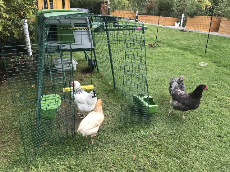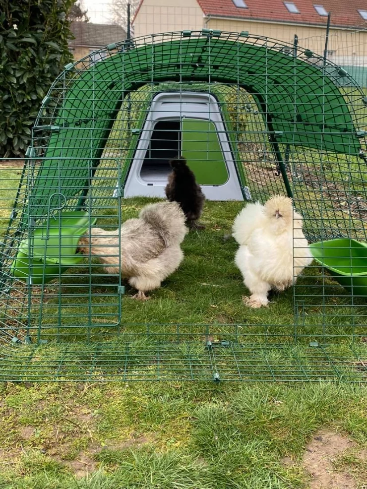 Caption: Green Eglu Cube groot kippenhok en ren met drie kippen