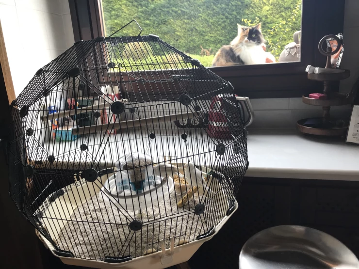 Caption: Een Geo vogelkooi maar een raam met een kat buiten.