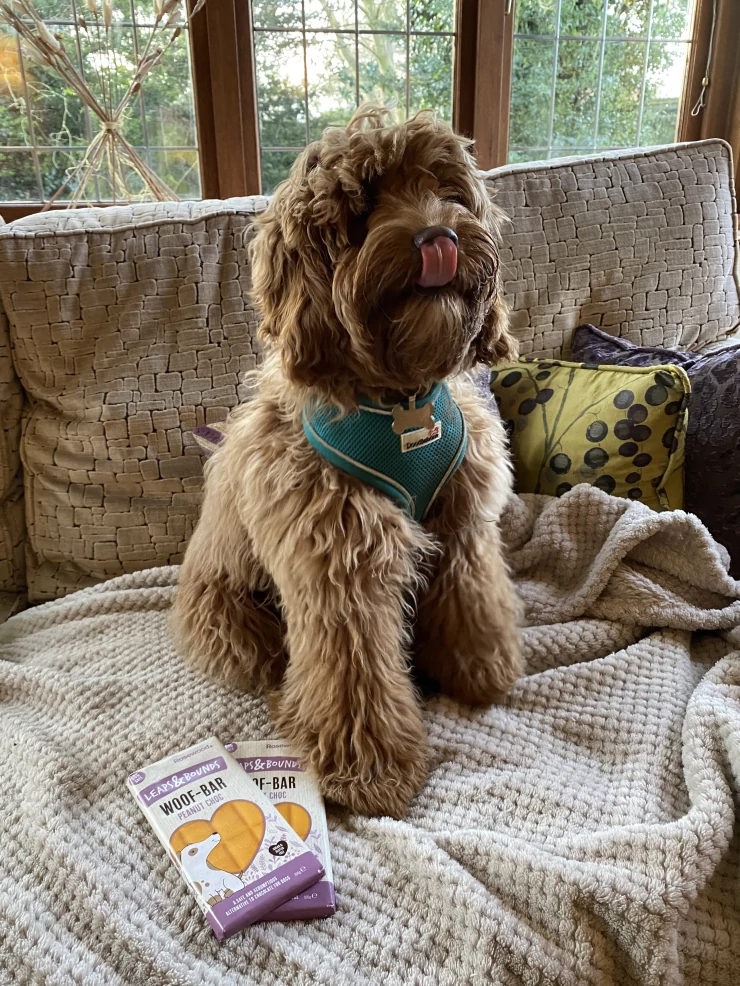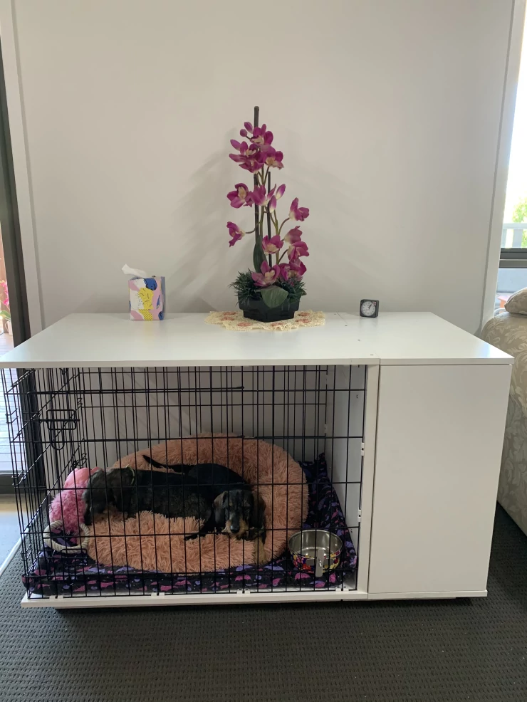 Caption: Een mini teckel veilig opgeborgen in een Omlet Fido Studio hondenkrat.