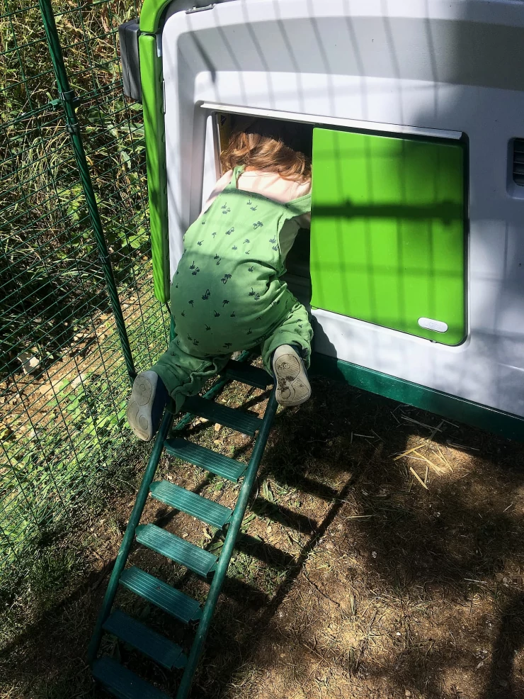 Caption: Kind klimt binnen in groen Eglu Cube groot kippenhok en ren