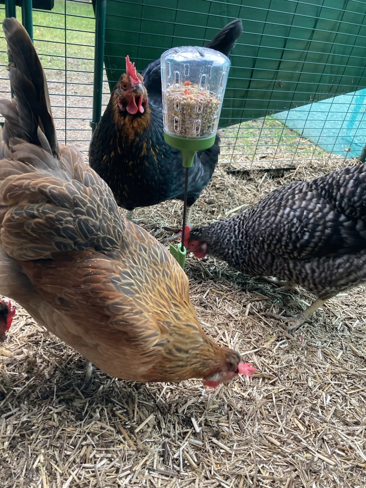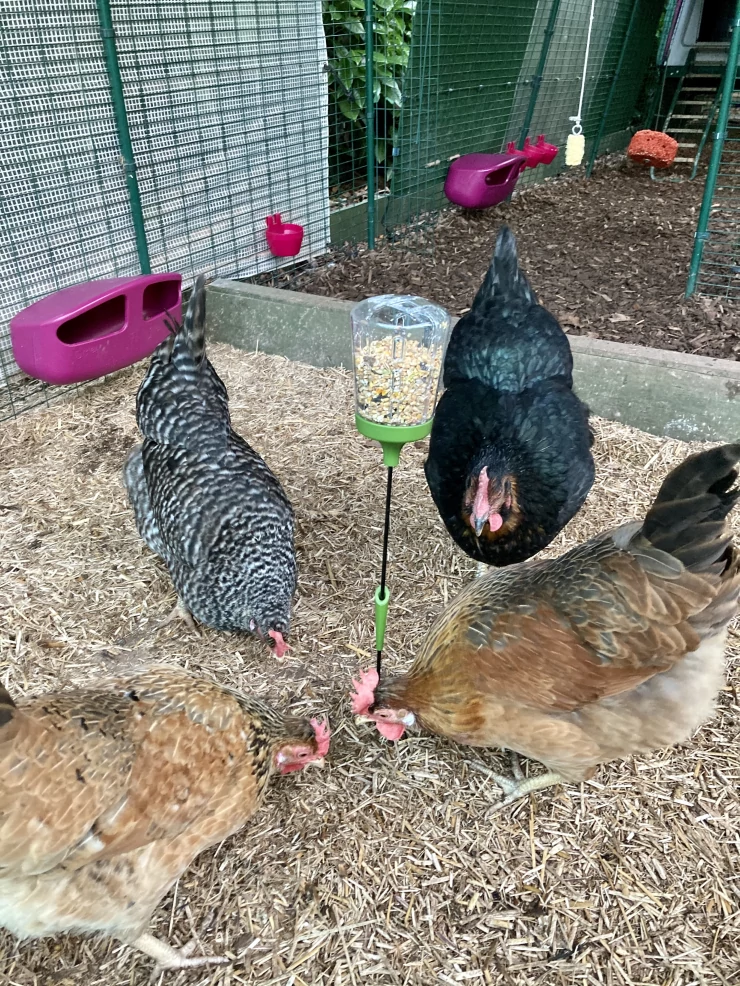 Caption: Kippen in een kippenren die pikken op een Caddi treat despencer.