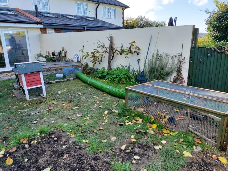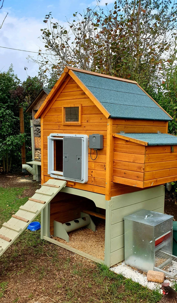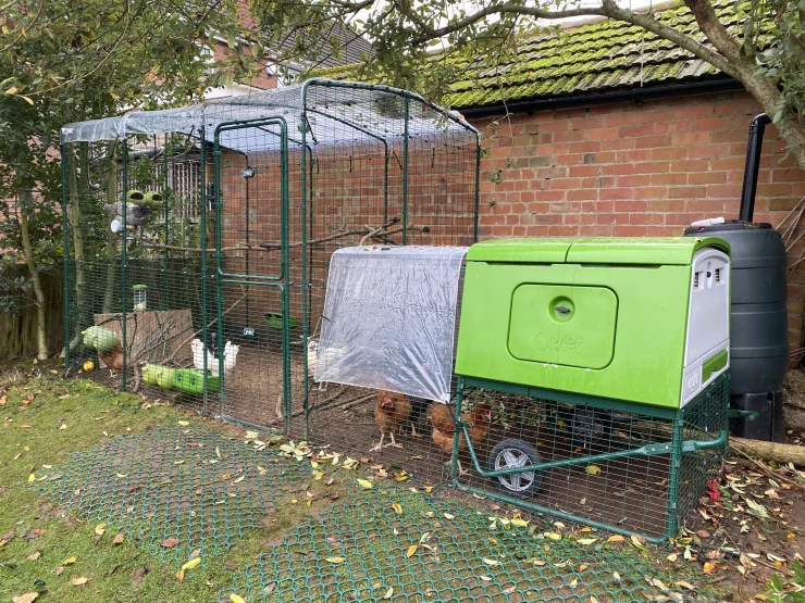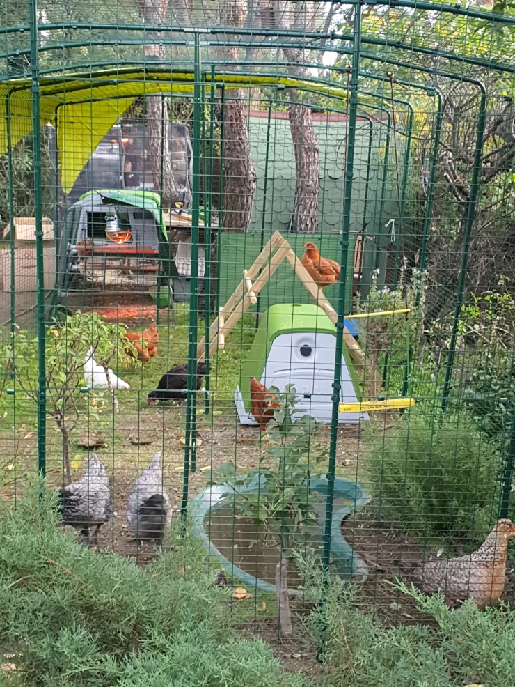 Caption: Eglu Cube groot kippenhok en Eglu Go kippenhok binnen van Omlet inloop kippenren