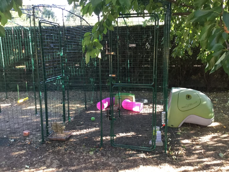 Caption: Groen Eglu Classic voor konijnen aangesloten op Omlet inloop konijnenren