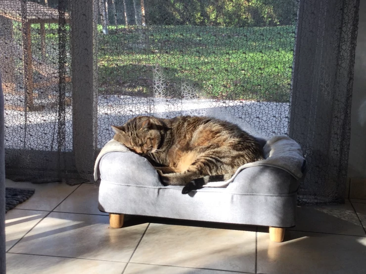 Caption: Kat slapend op Omlet grijs bolster kattenbed met ronde houten pootjes