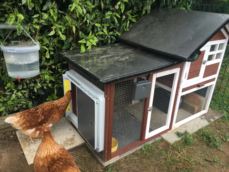 Caption: Omlet grijze automatische kippenhokdeur verbonden met houten kippenhok