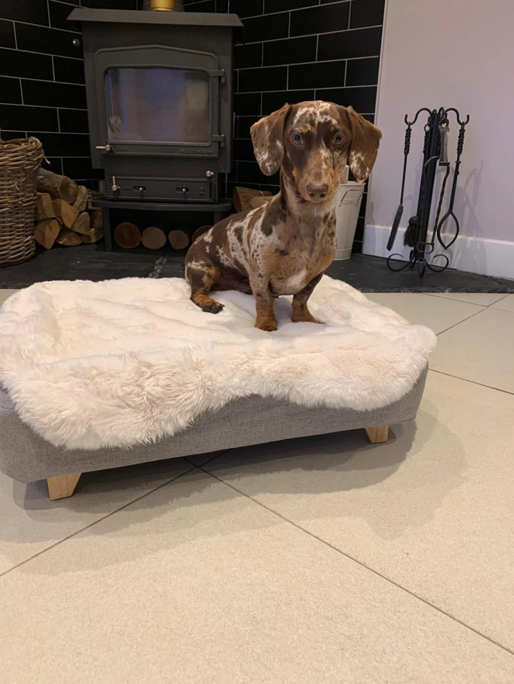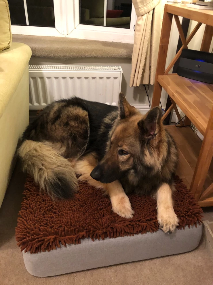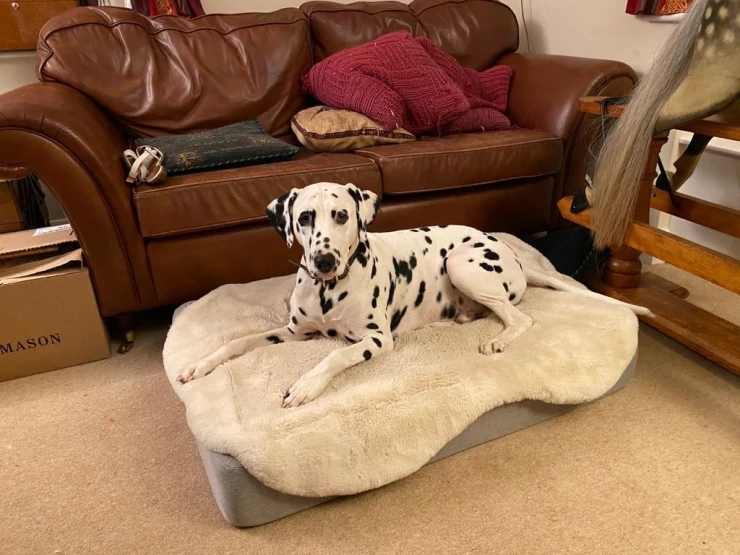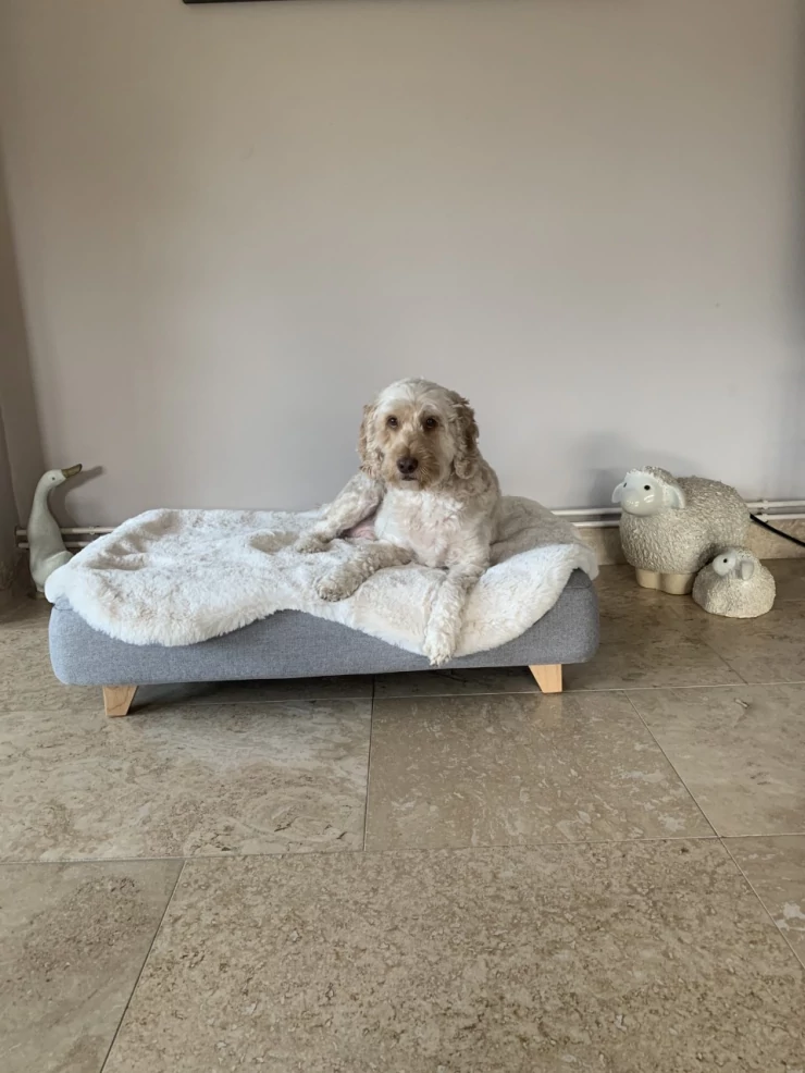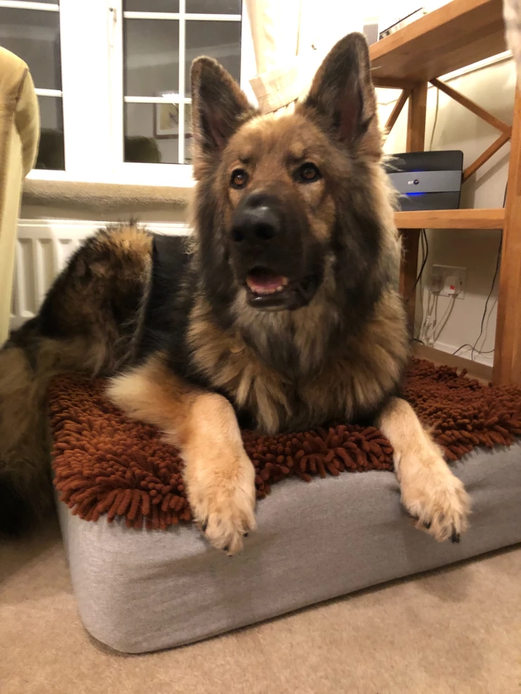Caption: Henry is gek op zijn hondenbed, vooral de bont topper!
