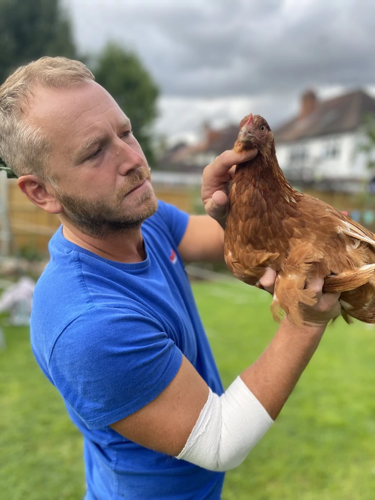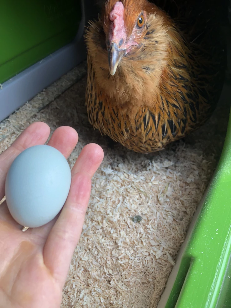 Caption: Kip in Eglu Cube groot kippenhok met handholding ei