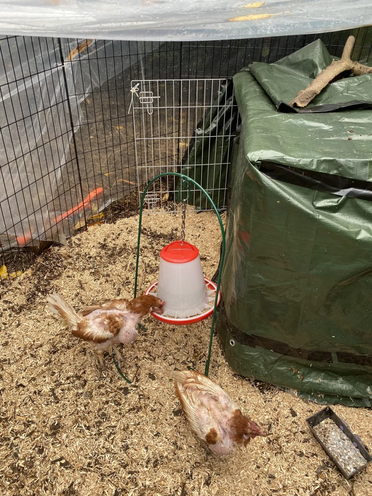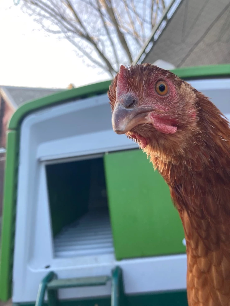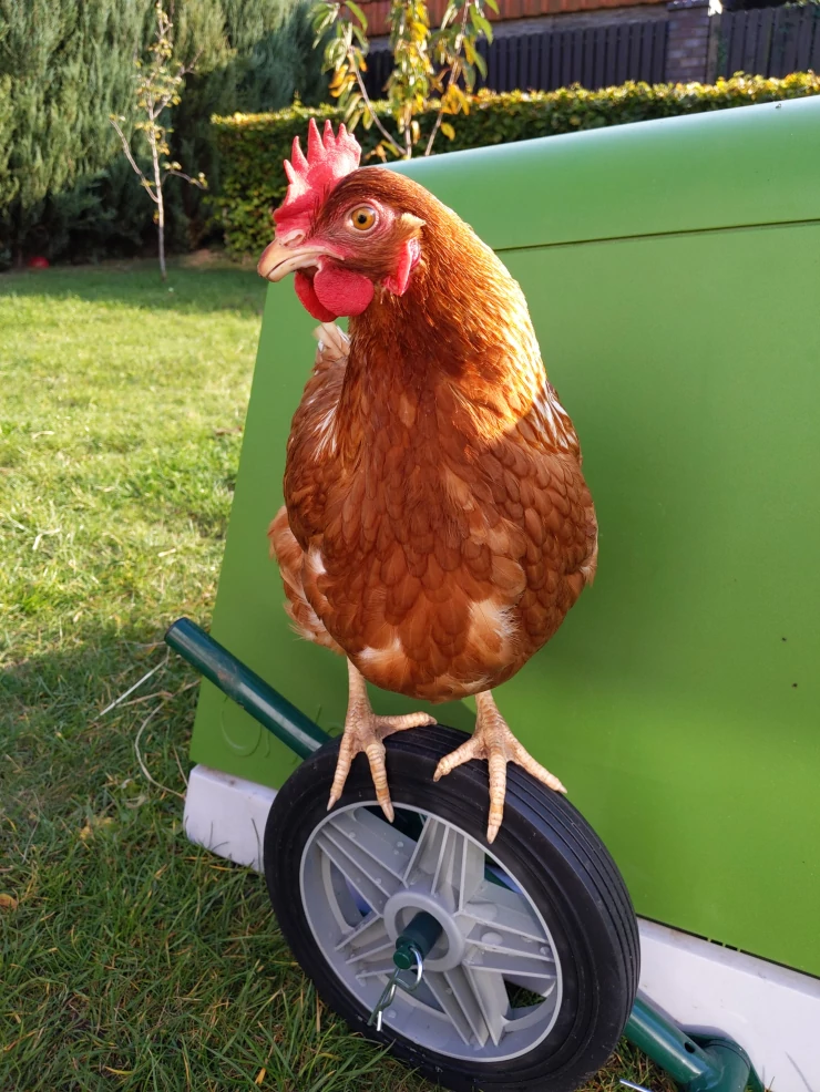 Caption: Kip staand op Eglu Go kippenhok wielen