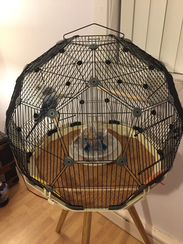 Caption: Omlet Geo vogelkooi met zwarte kooi, creme basis en poten