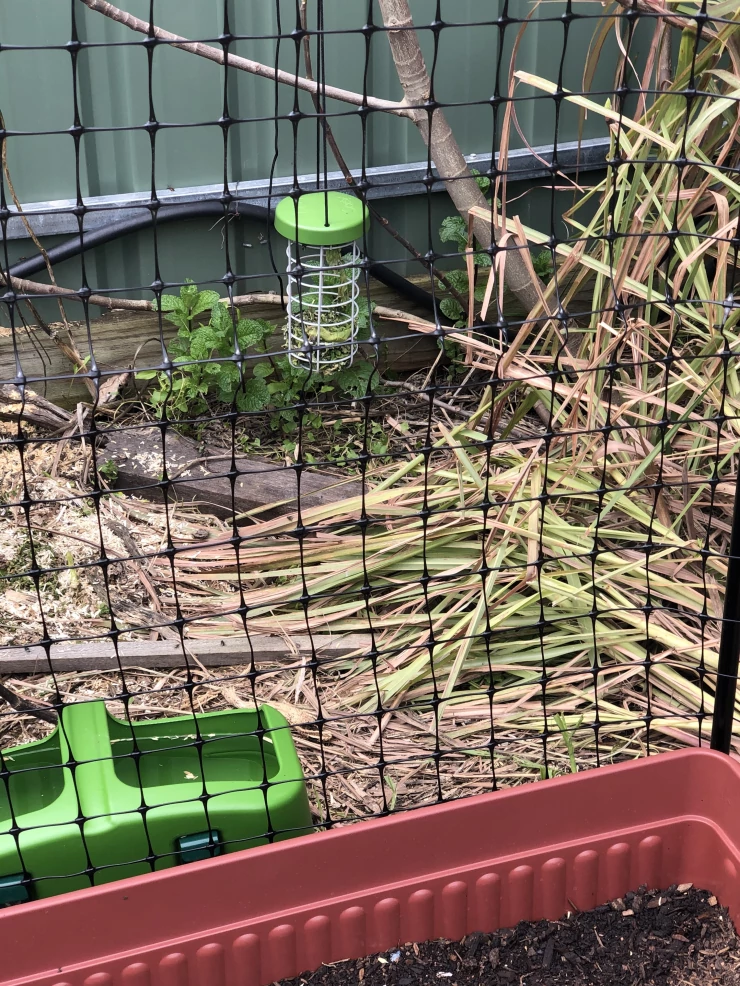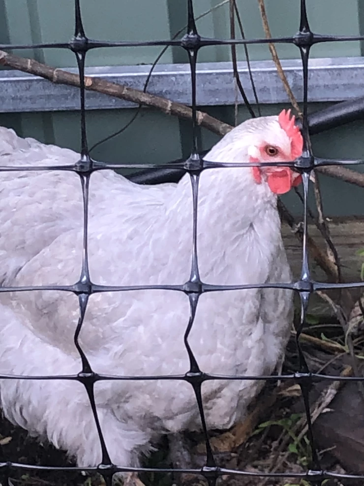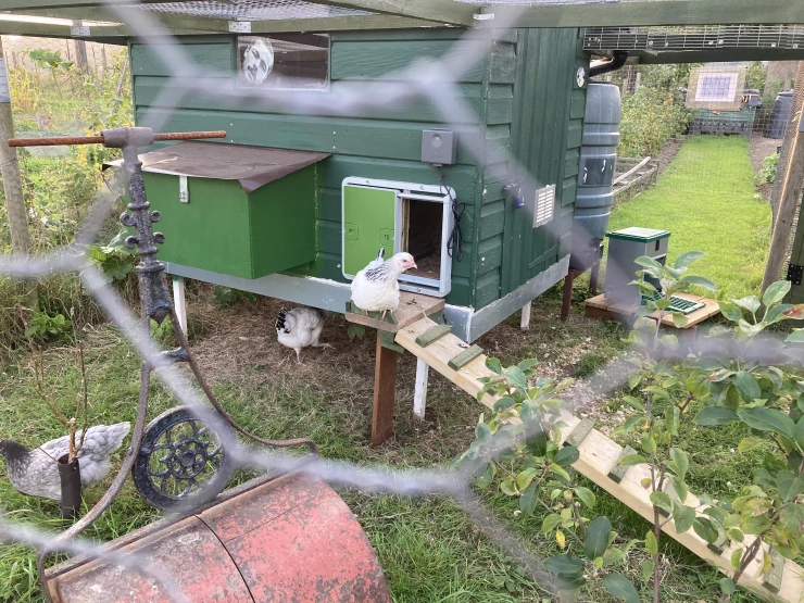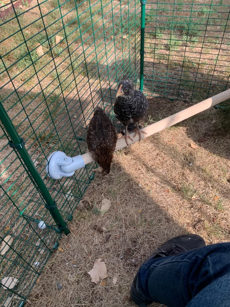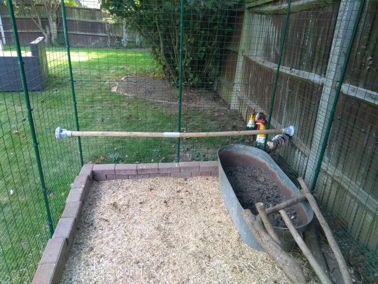 Caption: De kippen zijn dol op hun zitstok. overdag zie ik ze er vaak op zitten, maar als ik een foto probeer te maken, springen ze eraf om te eten!