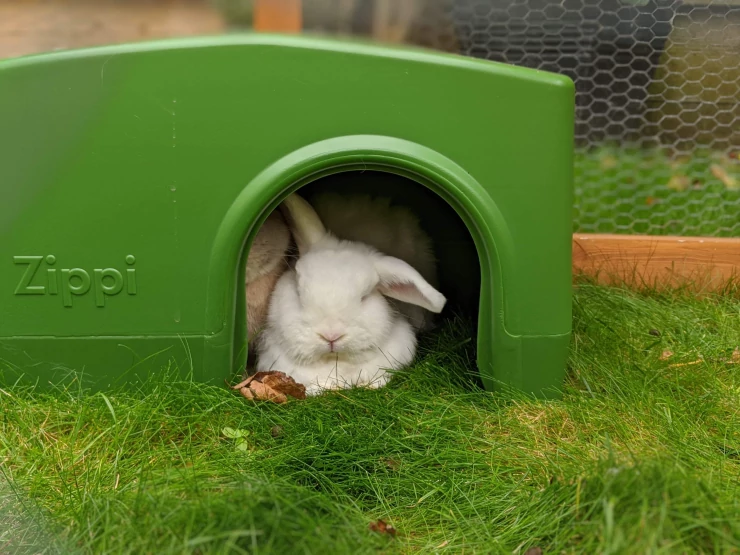 Caption: Wij zijn erg blij met de kwaliteitsvolle inrichting van ons Eglu Go hok, ren, tunnels en boxen voor onze konijnen!