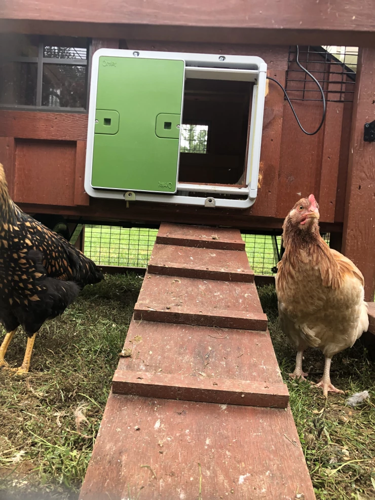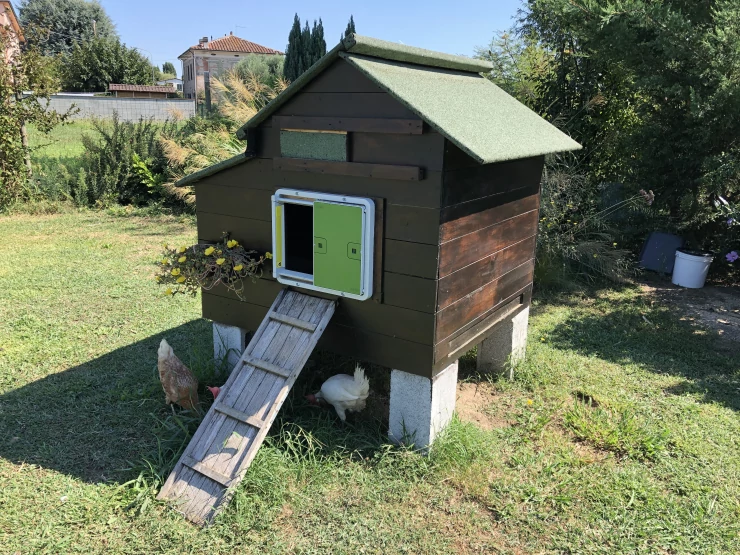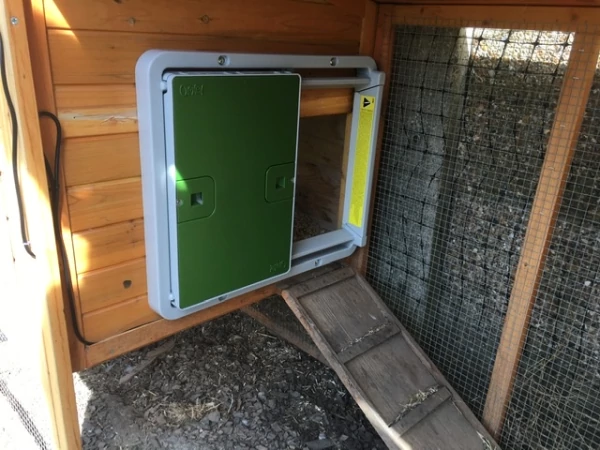 Caption: Een automatische deuropening geïnstalleerd op een houten kippenhok.