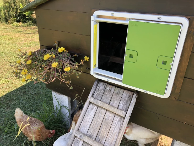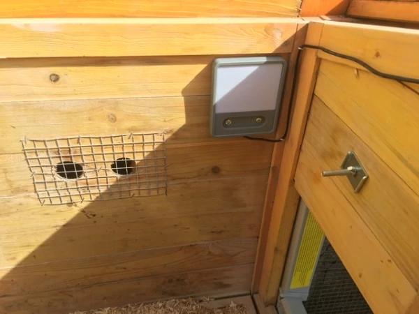 Caption: Een automatische deuropener geïnstalleerd op een houten kippenhok.