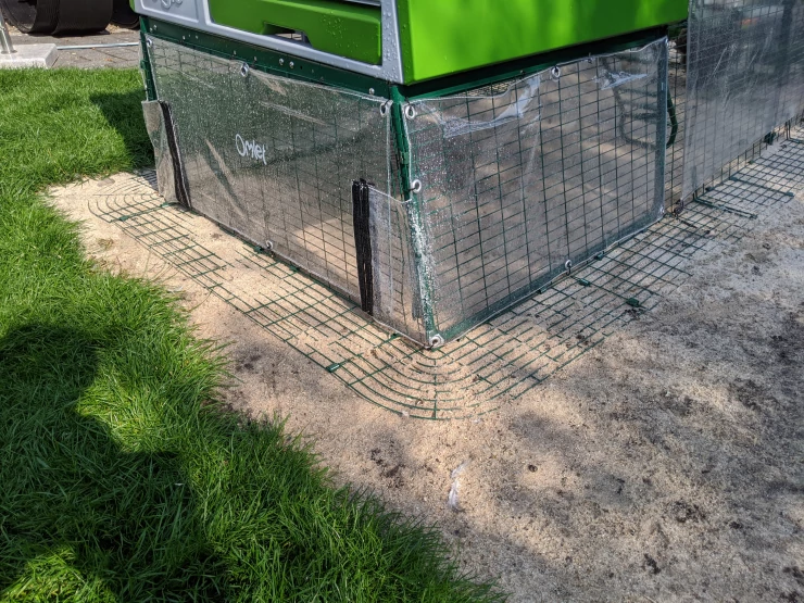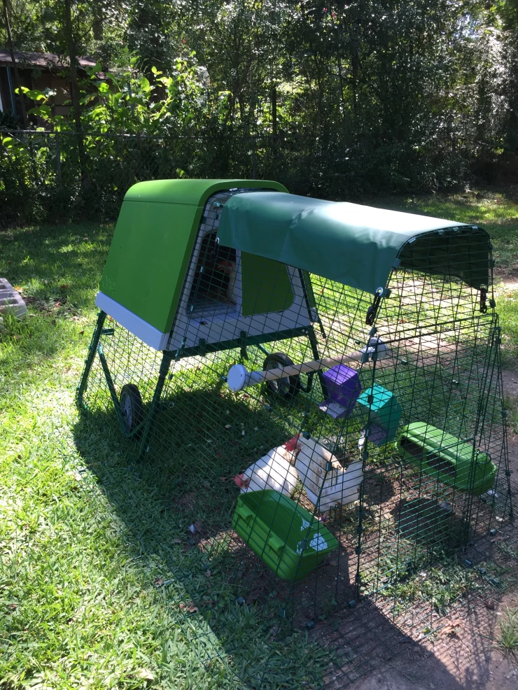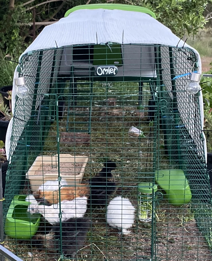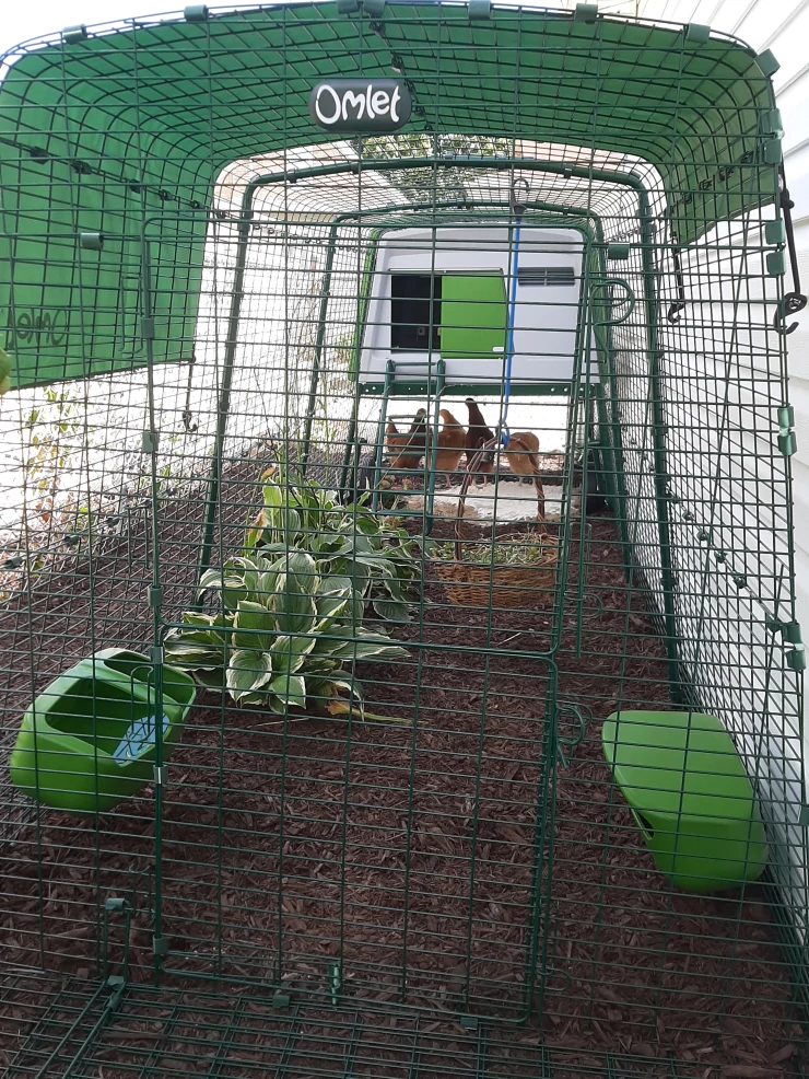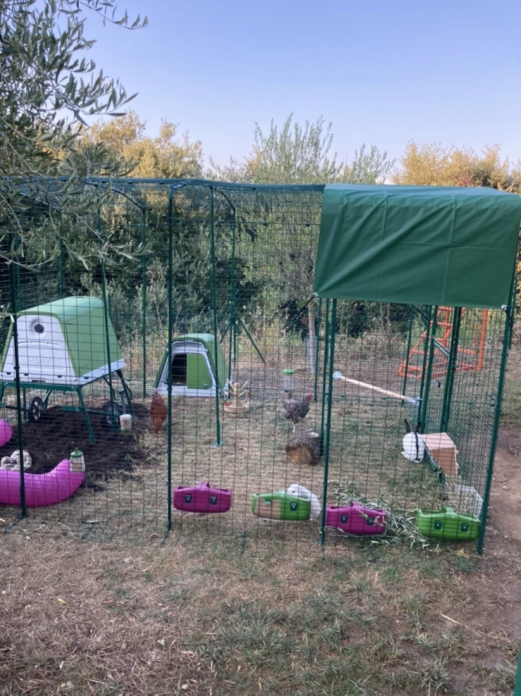 Caption: Een Eglu Cube kippenhok met doorzichtige kappen eronder.