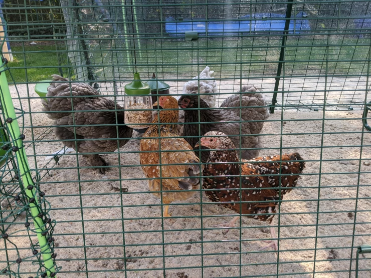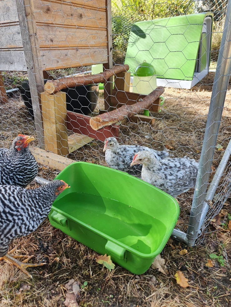 Caption: Kippen genieten van het drinken uit een Eglu Go drinker.