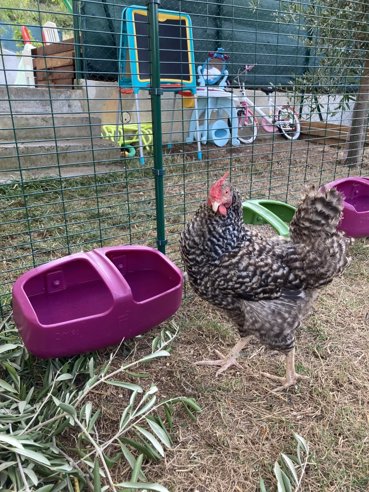 Caption: Een kip die drinkt van een Omlet kippendrinker.