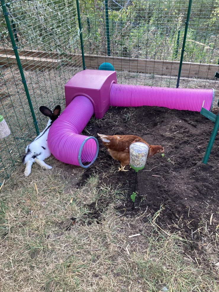 Caption: Konijnen en kippen die samenleven