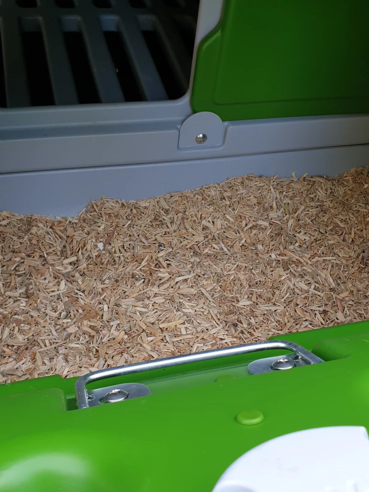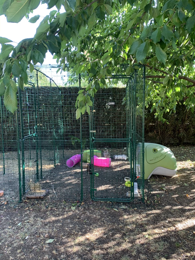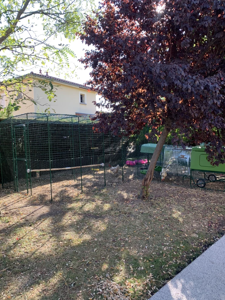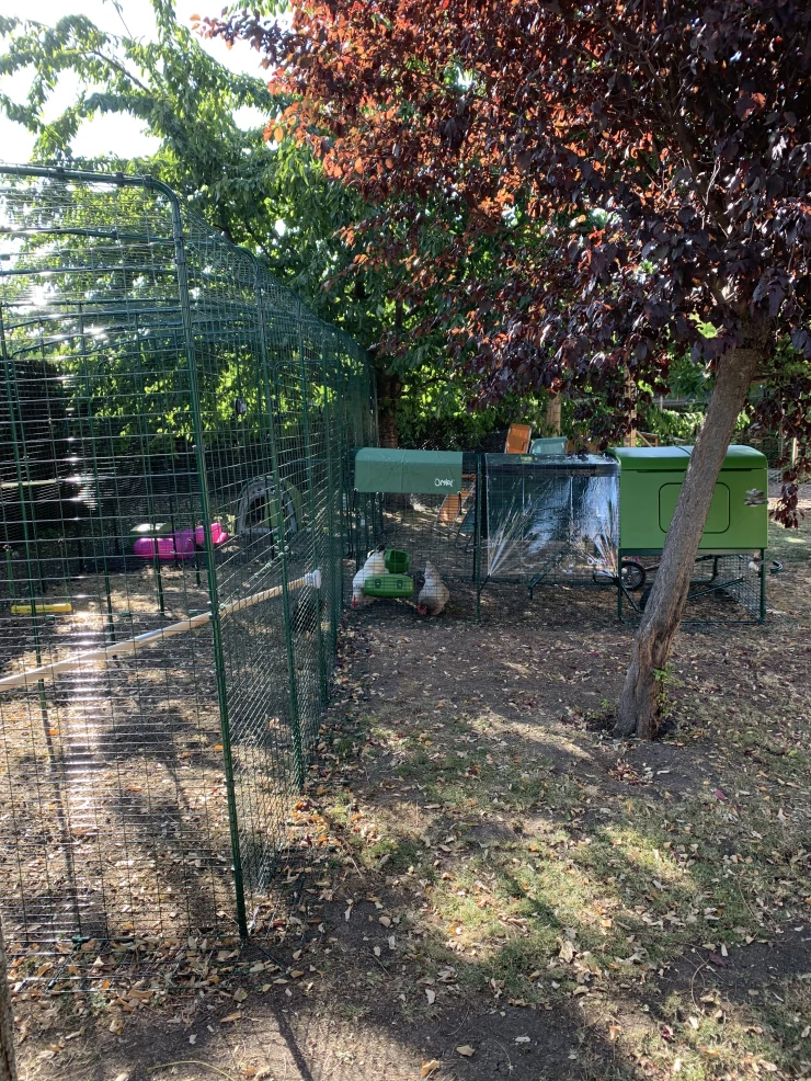 Caption: Een grote Eglu Cube kippenhok met wat kip erin.