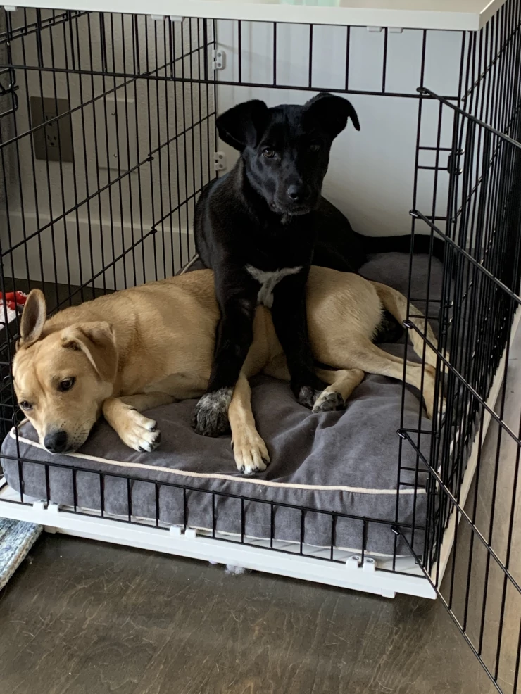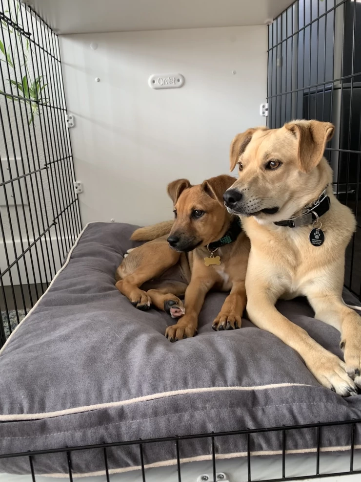 Caption: Twee honden delen een Fido Studio hondenkrat.