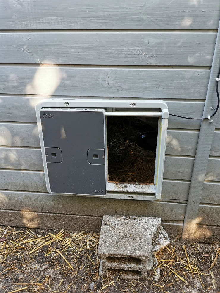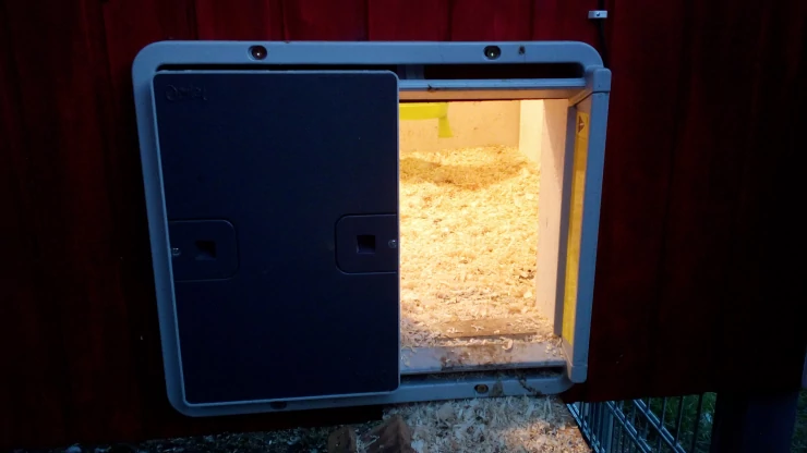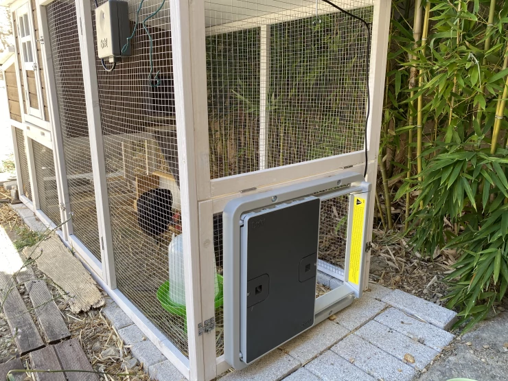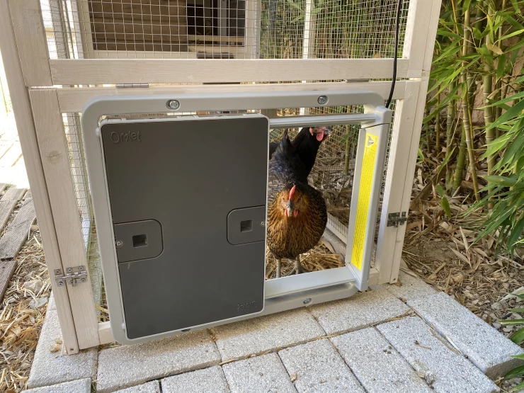 Caption: Een Omlet automatische deuropener bevestigde een grijs houten kippenhok.