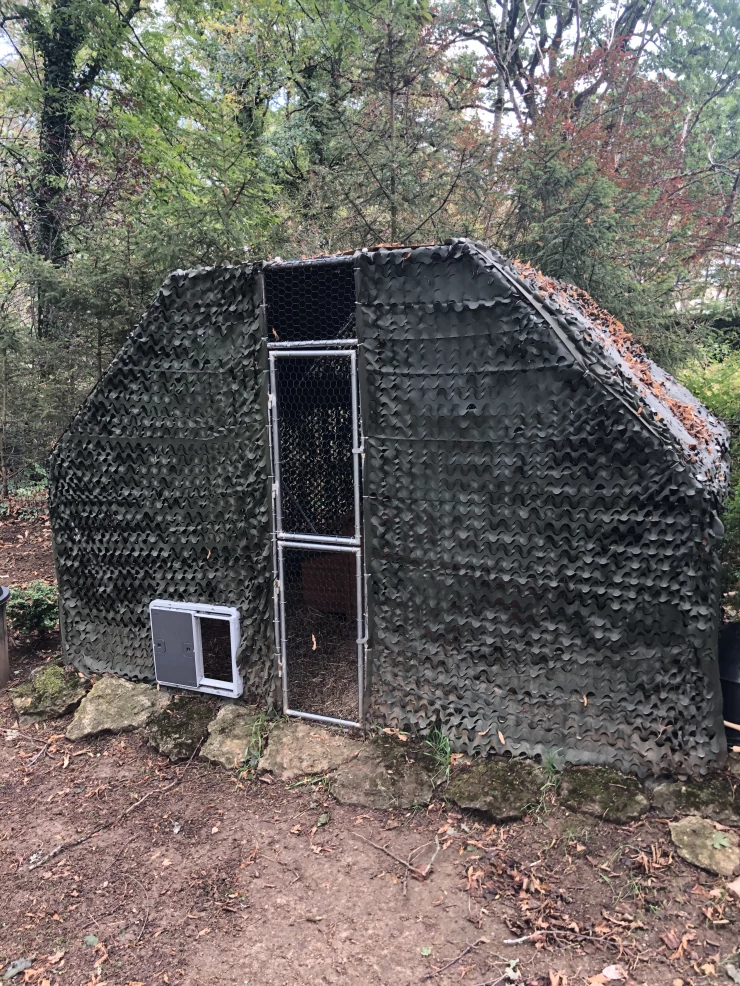Caption: Een Omlet automatische deuropener met licht om de kippen naar huis te leiden!