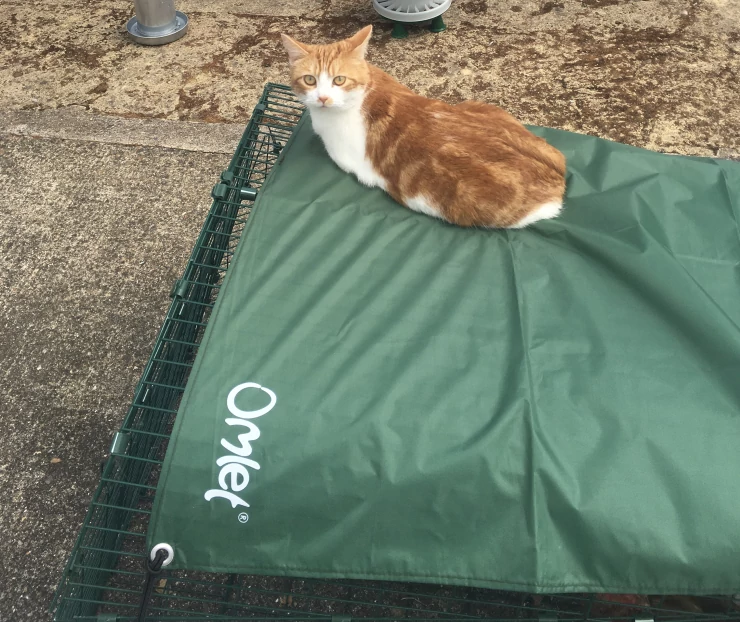 Caption: Een verhoogd platform voor katten in een Omlet catio