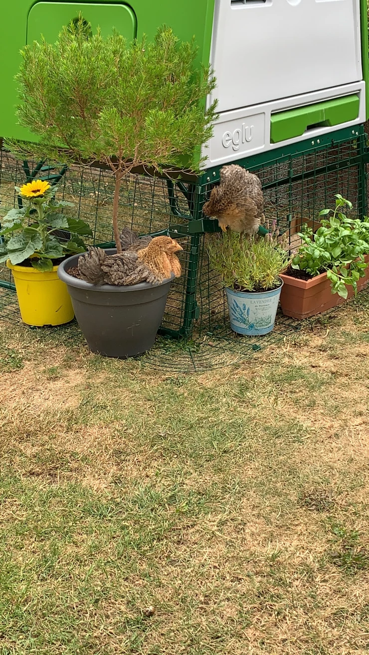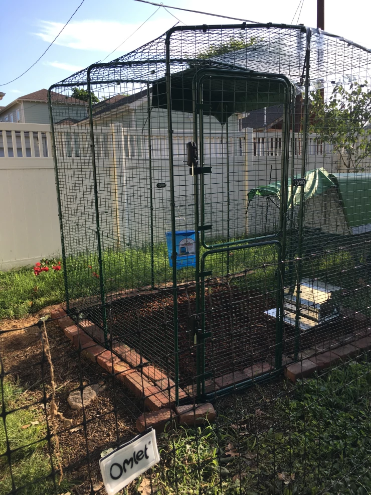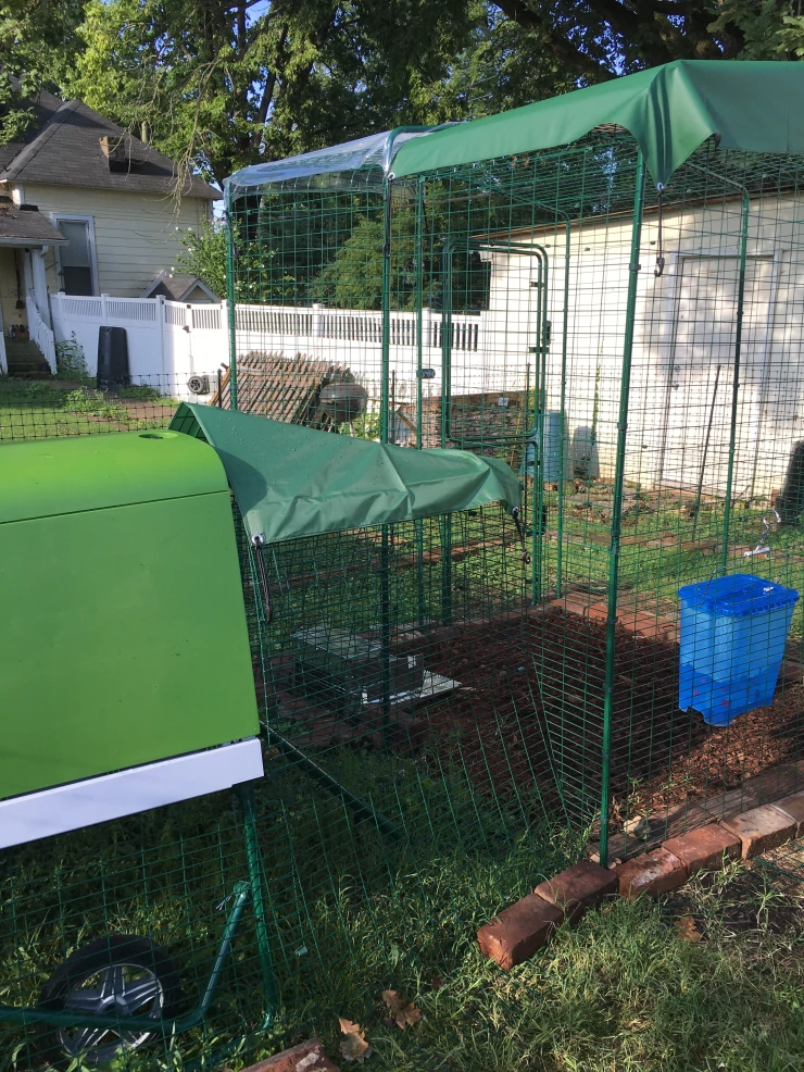 Caption: Hek op de voorgrond + omheinde tuin + Eglu Go -up