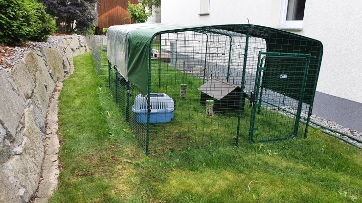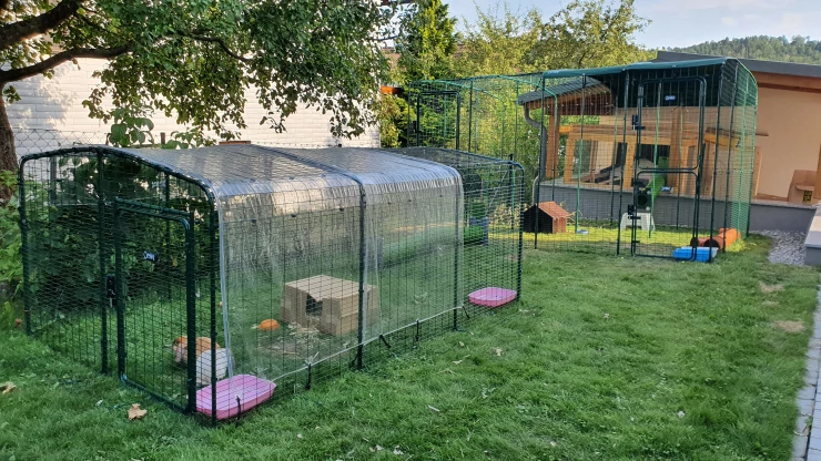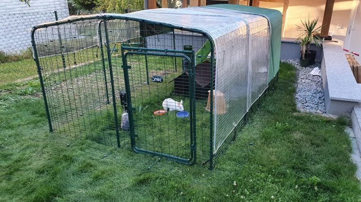 Caption: Een Zippi konijnenren kan worden gebruikt om een hok met een konijnenren te verbinden.