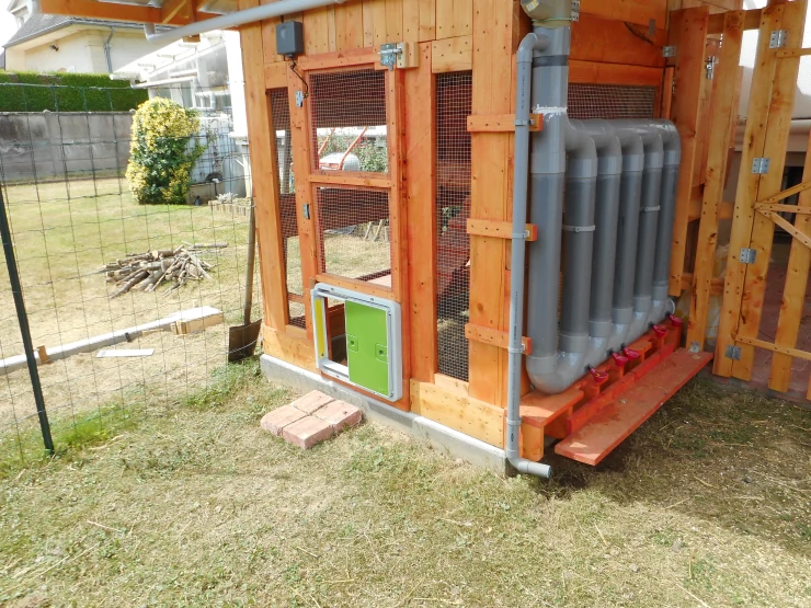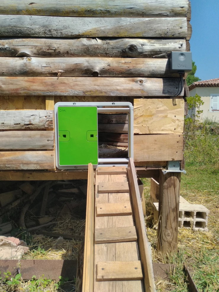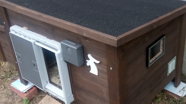Caption: Een houten hok met een automatische deuropener achteraf gemonteerd.