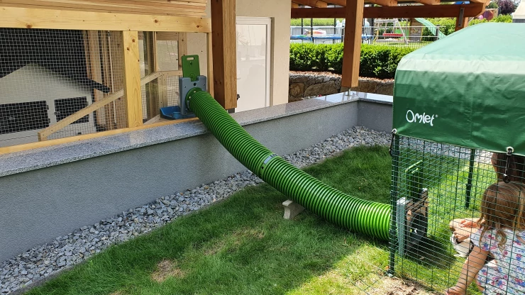 Caption: Een Zippi konijnenverbindingsbuis die een konijnenhok met een konijnenren verbindt.