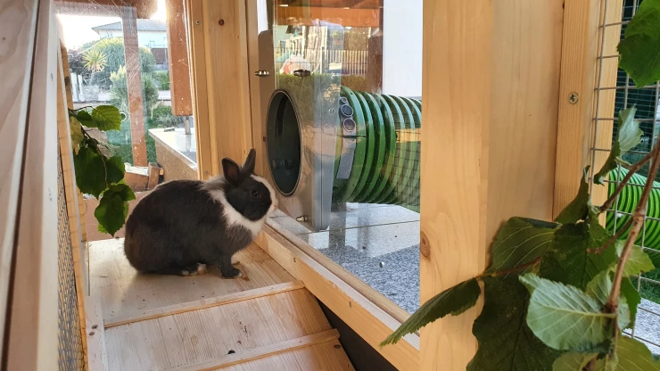 Caption: Een hoge inloop konijnen ren - geeft konijnen veel ruimte.