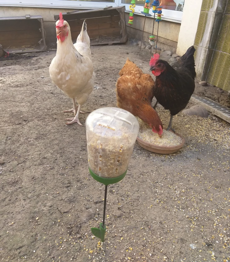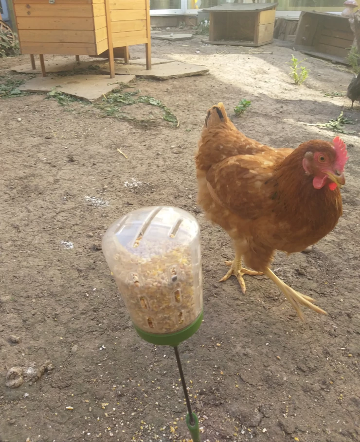 Caption: De Omlet kippensnoepautomaat voor kippen.