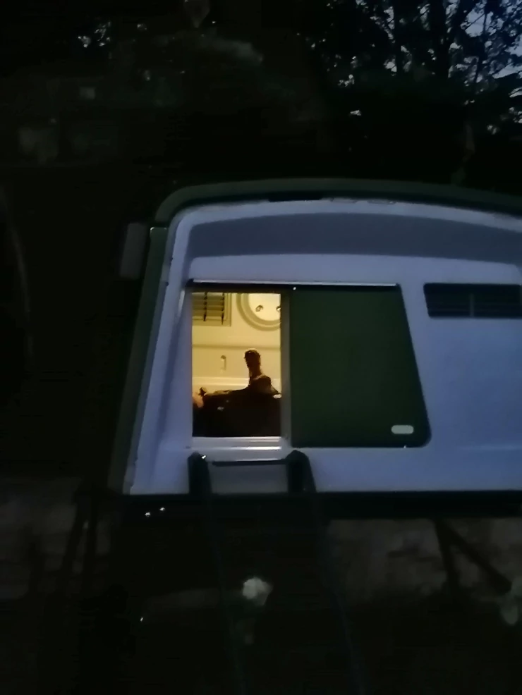 Caption: Groen Eglu Cube groot kippenhok en ren met hokverlichting aan