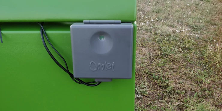 Caption: Het bedieningspaneel voor de automatische deur kan aan de buitenkant van het kippenhok worden geïnstalleerd.