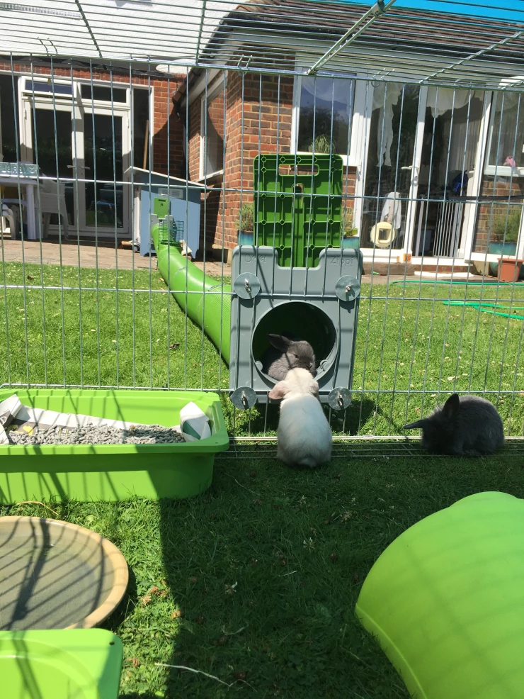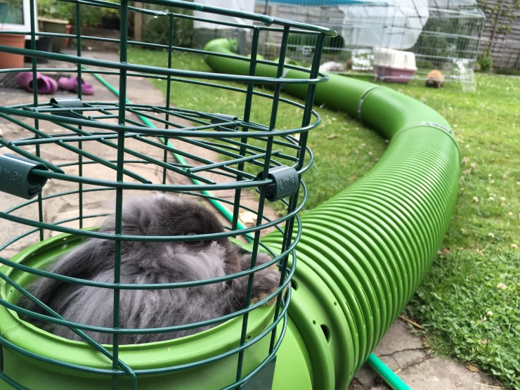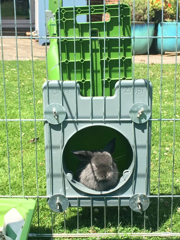 Caption: Twee cavia schuilplaatsen verbonden door een konijnentunnel.