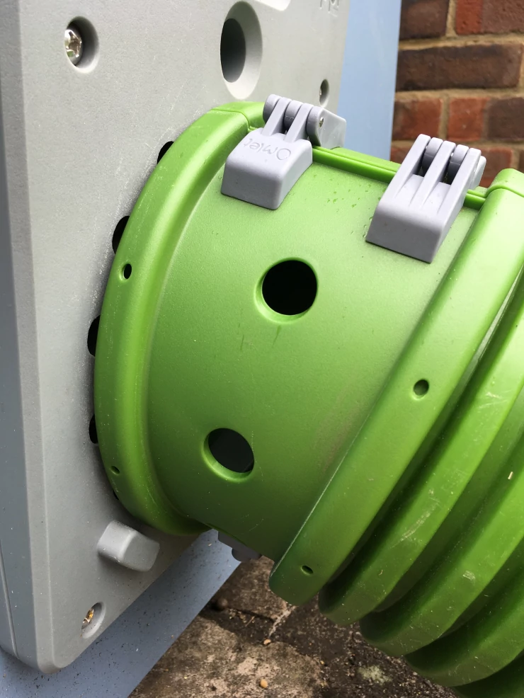 Caption: Het wiel aan de onderkant van het Eglu Cube kippenhok.