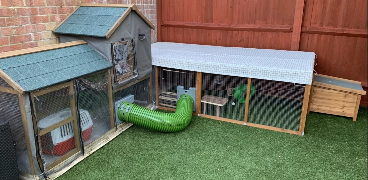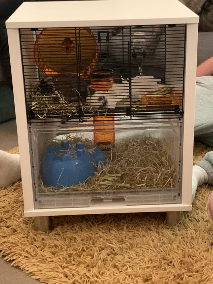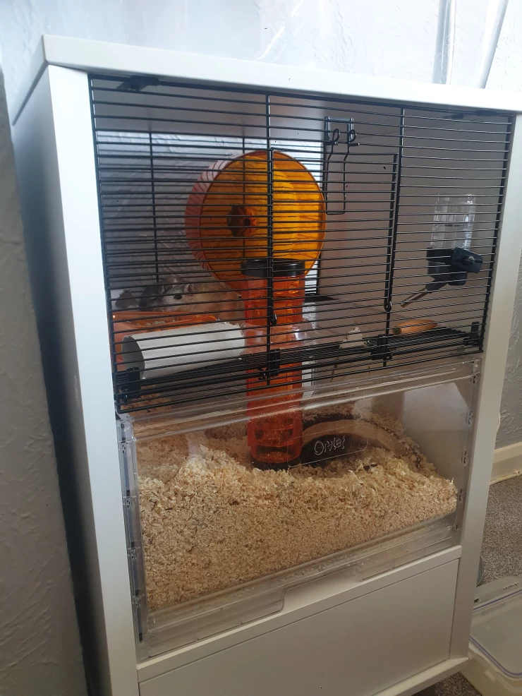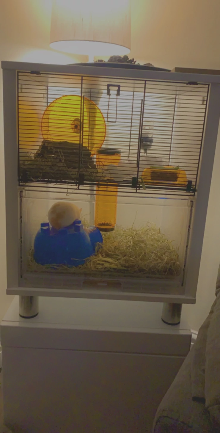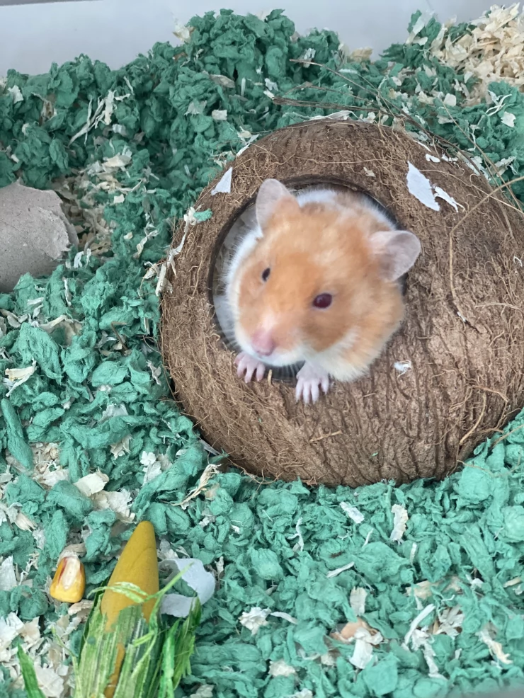 Caption: Onze hamster hulk houdt van haar nieuwe kokosnoot hut
