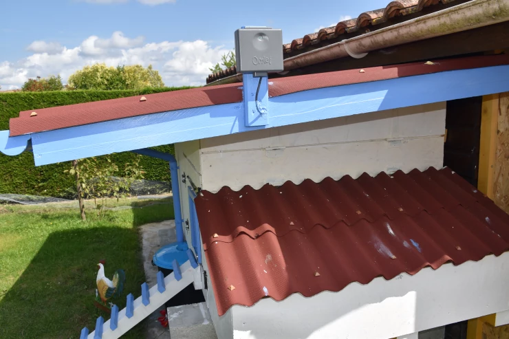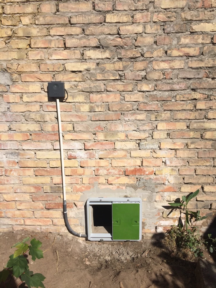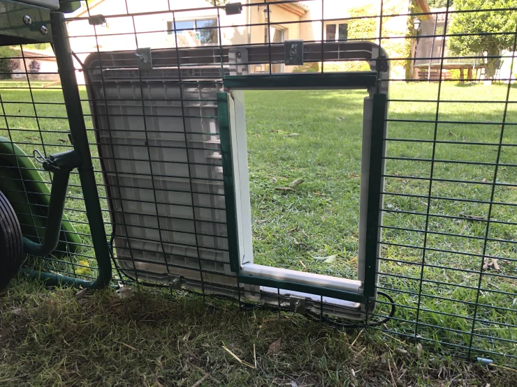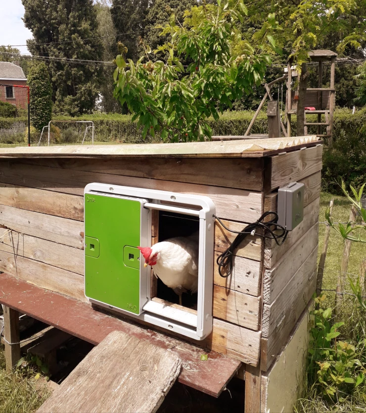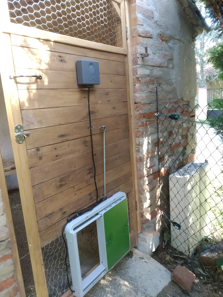 Caption: Een Omlet automatische deuropener bevestigd aan de binnenkant van een houten hok.